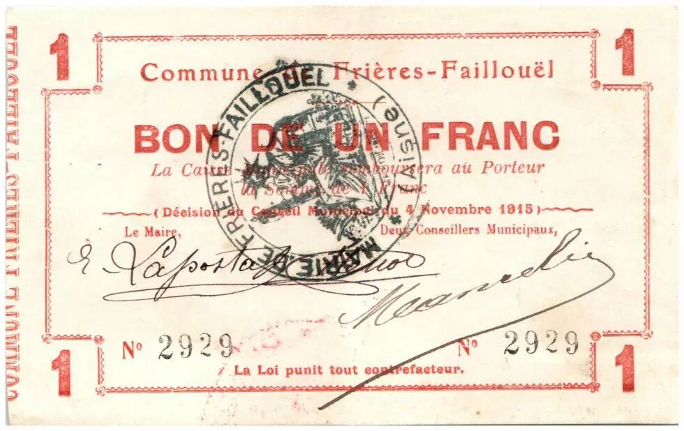 Banknote France 1 Franc Frieres-Faillouel City - 1915