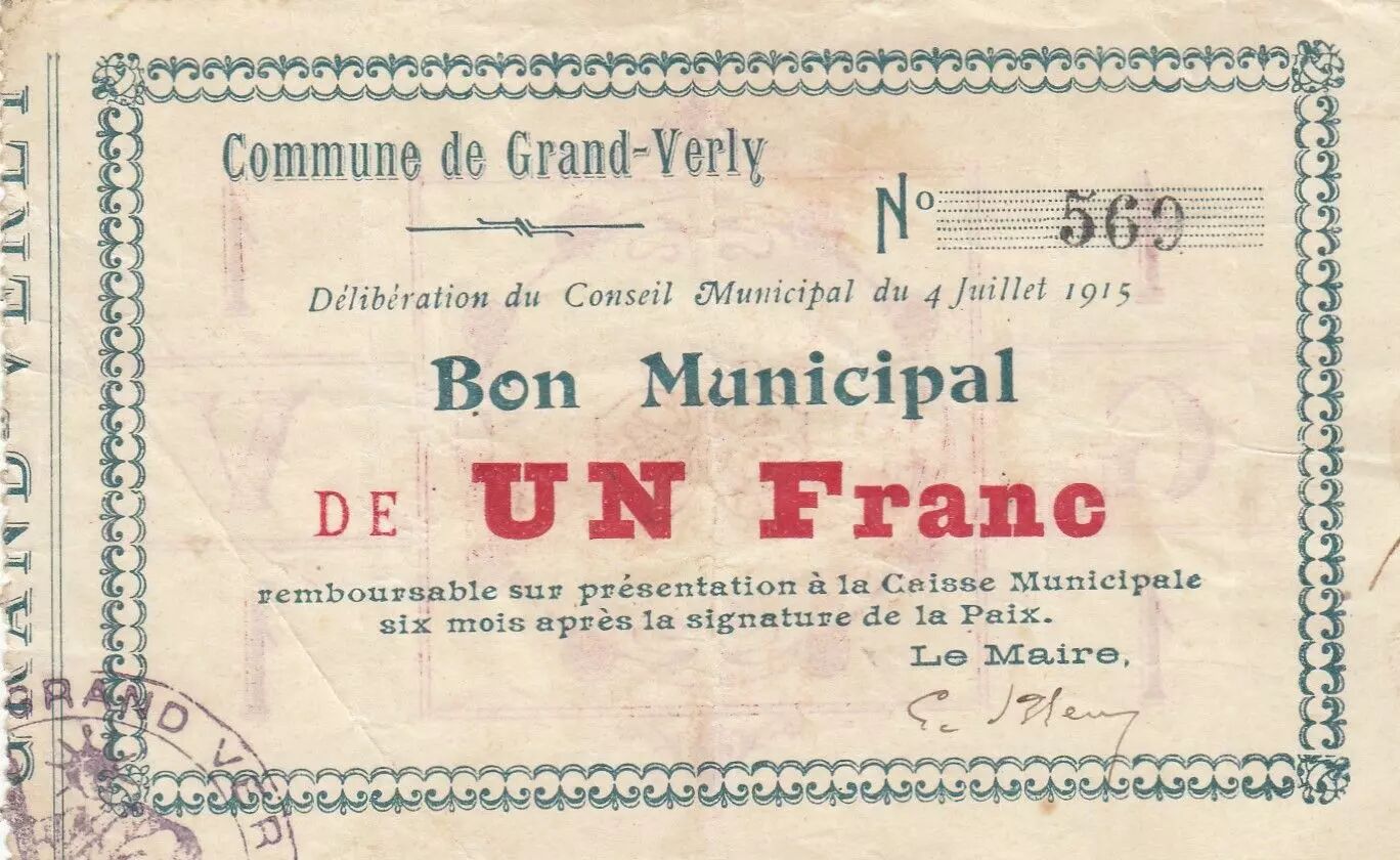 Billet France 1 Franc - Grand-Verly - Bon Municipal - 04-07-1915 - Numéro 569