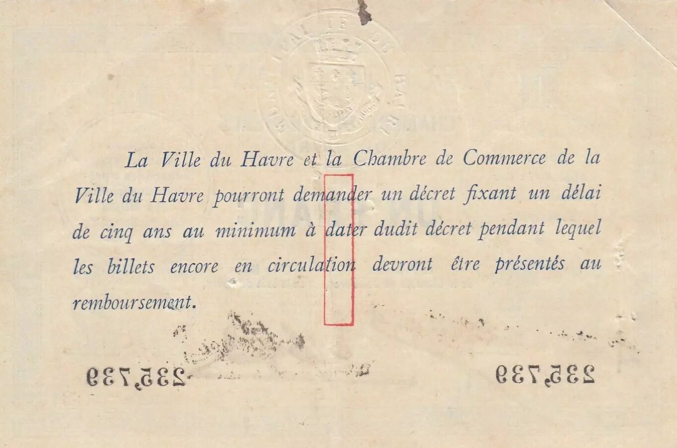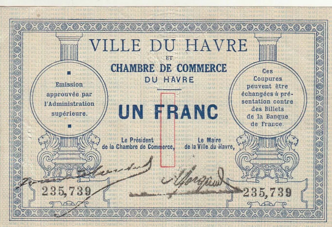Home > French Banknotes > Necessity Money (1789-1945) > 1914-1925 Chamber of Commerce > France 1 Franc - Havre - Chamber of Commerce - 1914 - Number 235 739