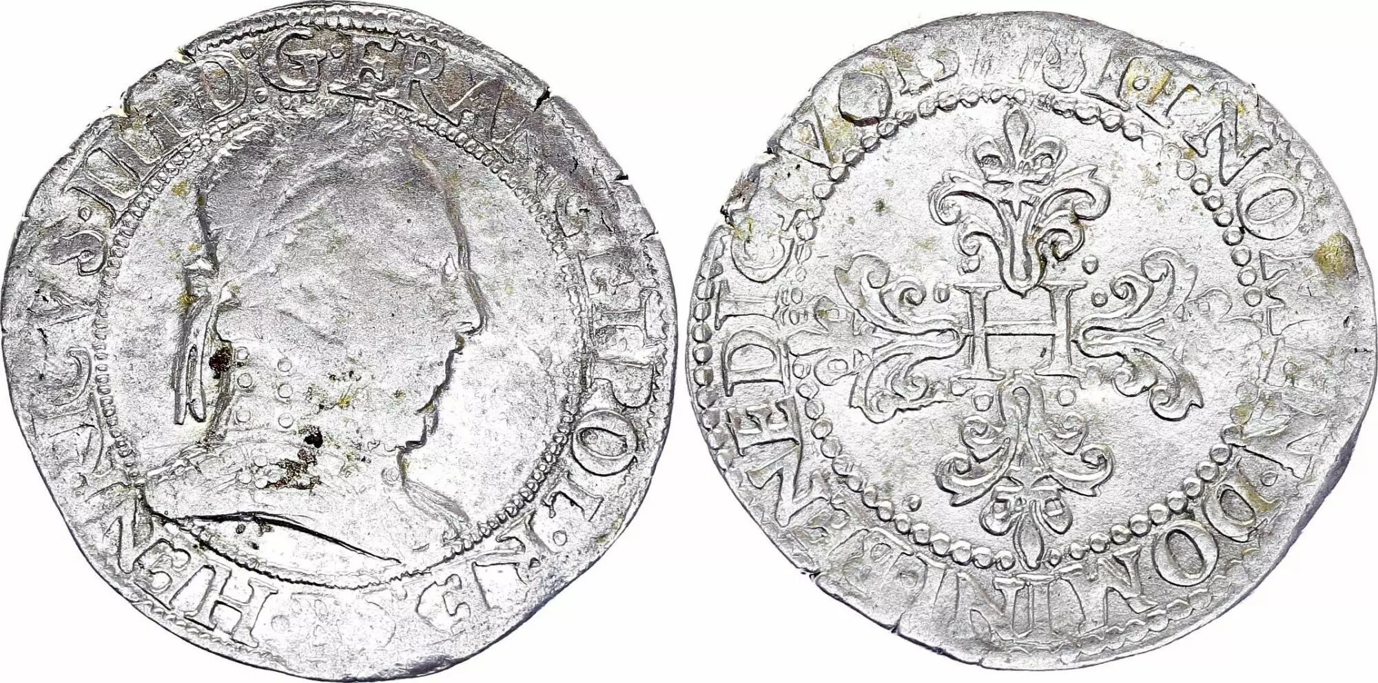 Coin France 1 Franc, Henri III Col Plat - 1577 B Rouen - Silver - VF
