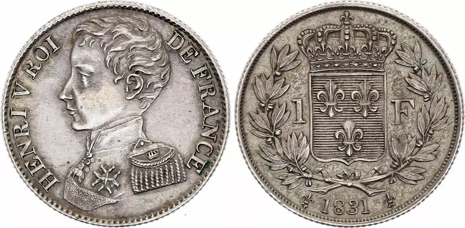 Avers : Le portrait d'Henri V (enfant à l'époque) peut être représenté sur l'avers, entouré de l'inscription "HENRI V ROI DE FRANCE".