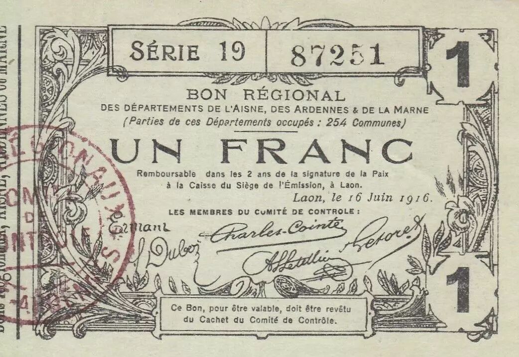 Billet France 1 Franc - Laon - Bon Régional - 16-06-1916 - Série 19