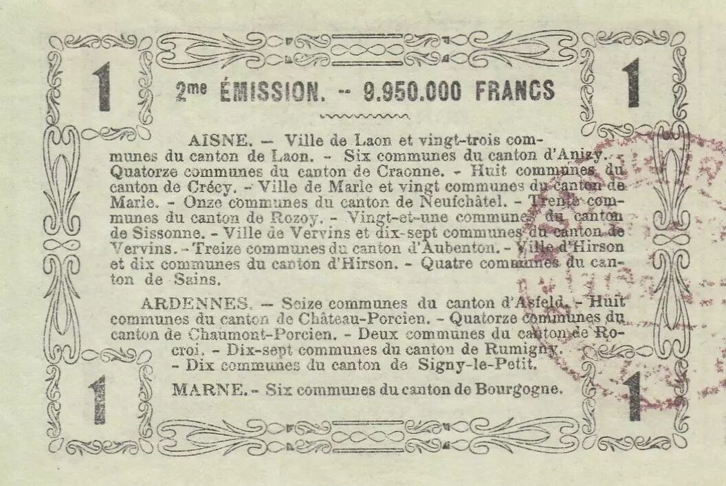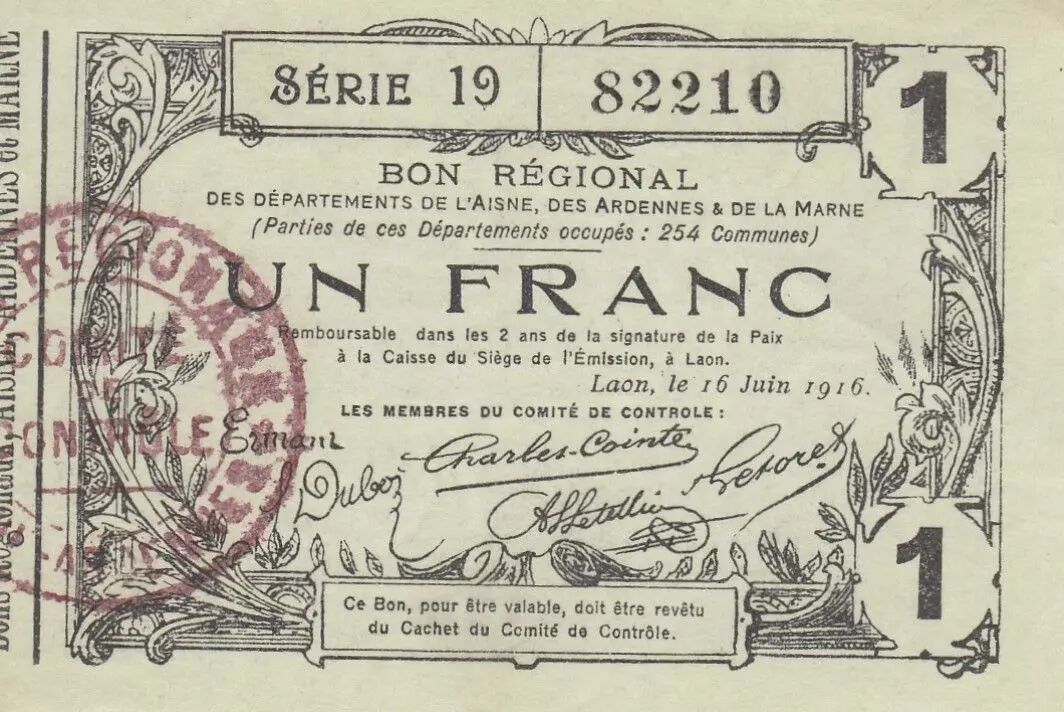 Ce billet de banque est une coupure de 1 franc, émis en France. Il s'agit d'un Bon Régional émis à Laon, daté du 16 juin 1916, et appartenant à la Série 19.