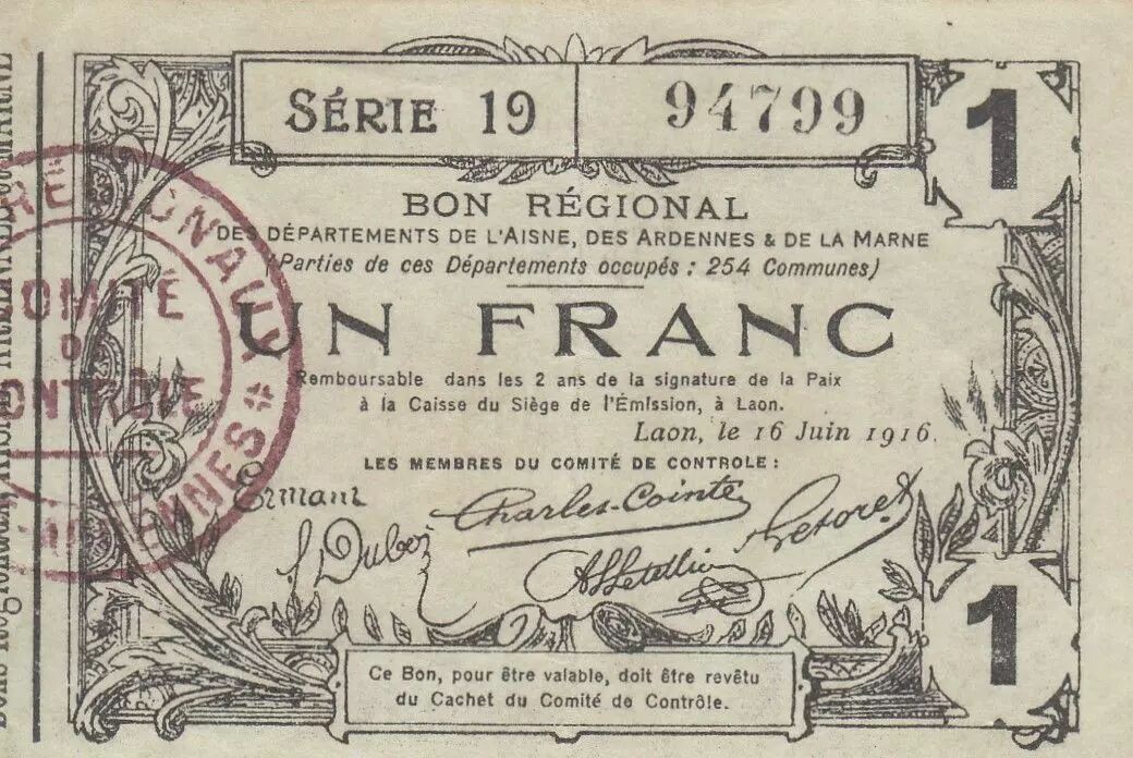 Banknote France 1 Franc - Laon - Regional Coupon - 16-06-1916 - Serial 19