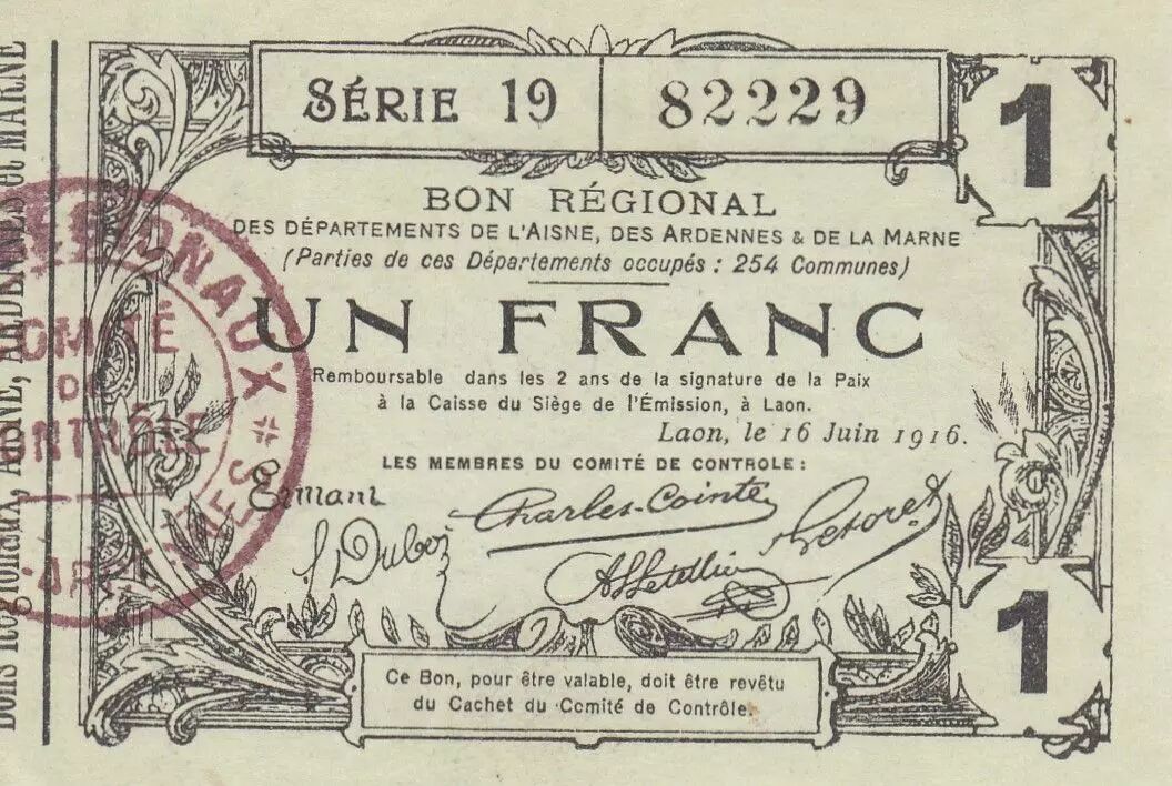 Home > > France 1 Franc - Laon - Regional Coupon - 16-06-1916 - Serial 19