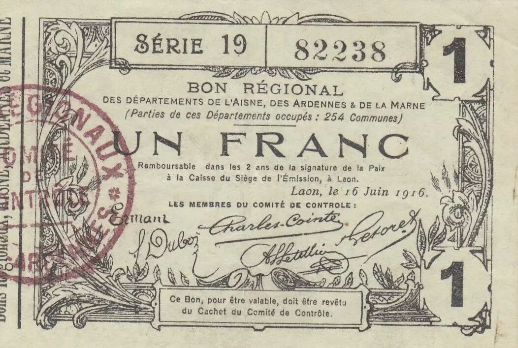 Banknote France 1 Franc - Laon - Regional Coupon - 16-06-1916 - Serial 19
