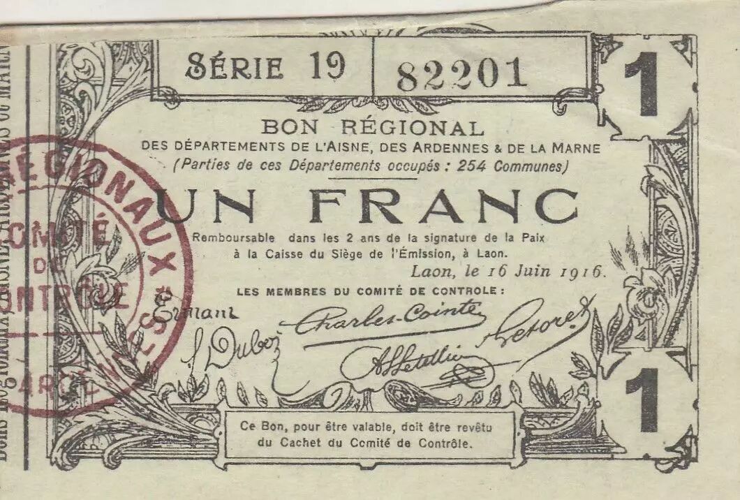 Banknote France 1 Franc - Laon - Regional Coupon - 16-06-1916 - Serial 19