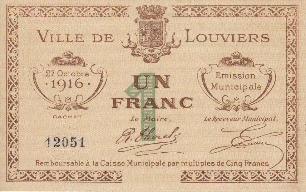 Banknote France 1 Franc Louviers City - 1916