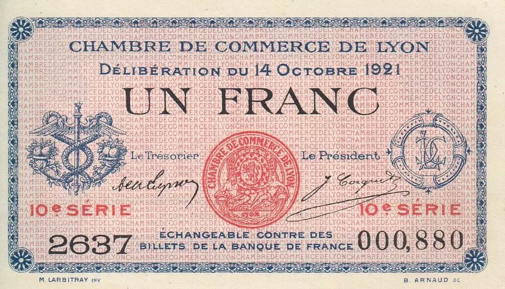 Banknote France 1 Franc - Lyon - Chamber of Commerce - 14-10-1921 - Tenth Serial
