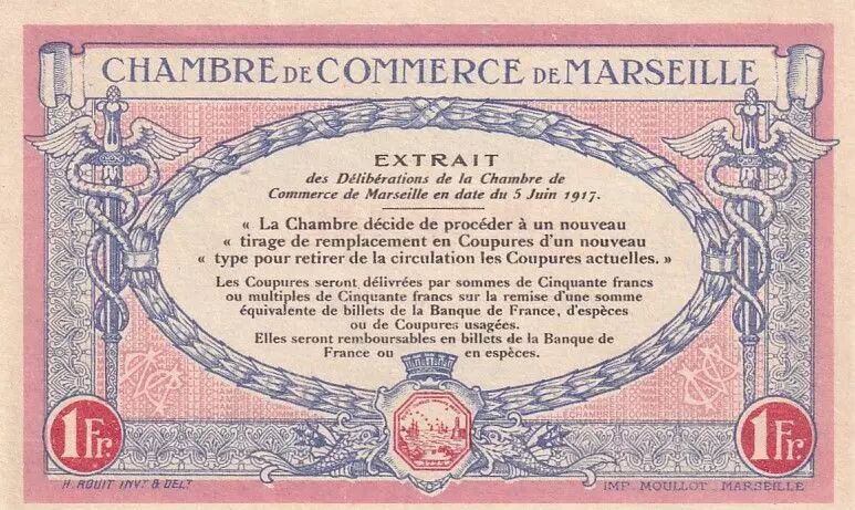 The back of the banknote features an extract from the deliberations of the Marseille Chamber of Commerce. This text explains the decision to proceed with a new replacement print run to withdraw the current banknotes from circulation. It specifies that the new banknotes will be issued in sums of fifty francs or multiples, in exchange for banknotes from the Banque de France, cash or used banknotes. In addition, it is indicated that these banknotes are redeemable in Banque de France banknotes or cash. The value "1Fr." is repeated twice on this side.