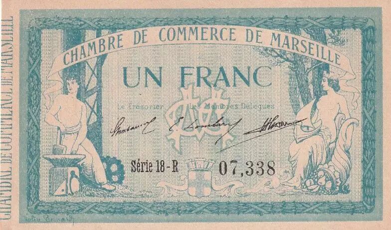 This 1 Franc note was issued by the Marseille Chamber of Commerce, dated August 12, 1914, and is part of the 18-R series. It represents a form of emergency currency issued in a particular economic context linked to the First World War.
