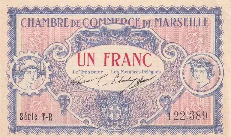 Au recto du billet, la mention "CHAMBRE DE COMMERCE DE MARSEILLE" est clairement affichée, soulignant l'institution émettrice. La valeur nominale, "UN FRANC", est également bien visible. On y trouve aussi les signatures du Trésorier et des Membres Délégués, authentifiant le billet.
