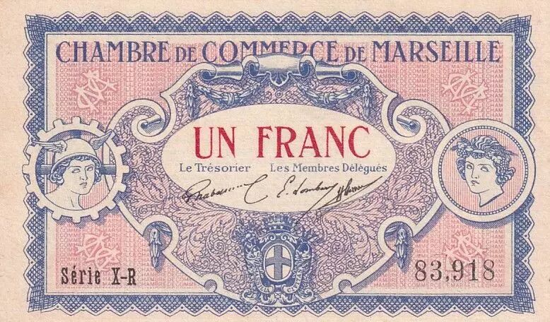 Ce billet de banque français, d'une valeur nominale de un franc, a été émis le 5 juin 1917 par la Chambre de Commerce de Marseille. Il appartient à la série X-R et présente des inscriptions en langue latine.