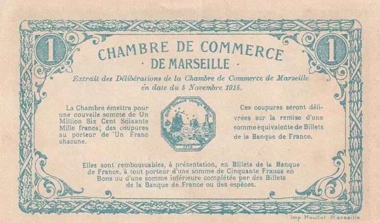 L'imprimeur identifié est l'Imprimerie Moullot & fils aîné, située à Marseille, en France. La présence de ces informations permet de contextualiser la production du billet dans le tissu économique et industriel de la région marseillaise de l'époque.