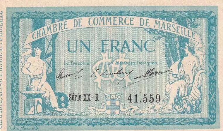Sur le recto du billet, on peut lire l'inscription "CHAMBRE DE COMMERCE DE MARSEILLE" en haut, suivie de la valeur "UN FRANC". On y trouve également les mentions "Le Trésorier" et "Les membres Délégués", ainsi que la série "SERIE XX-R". Le nom de Valère Bernard est aussi présent, probablement en tant que dessinateur du billet.