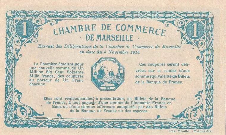 Ce billet de banque a été émis par la Chambre de Commerce de Marseille le 5 novembre 1915. Il représente une valeur nominale d'un franc. La langue utilisée sur ce billet est le latin.
