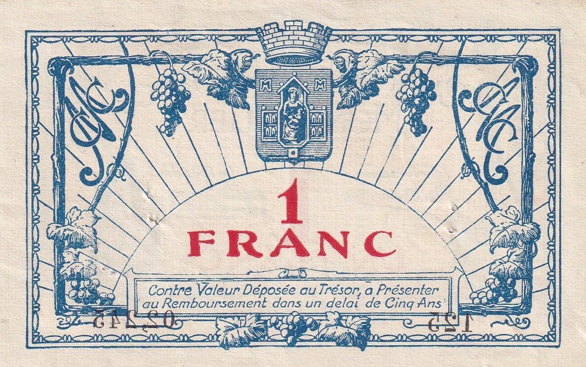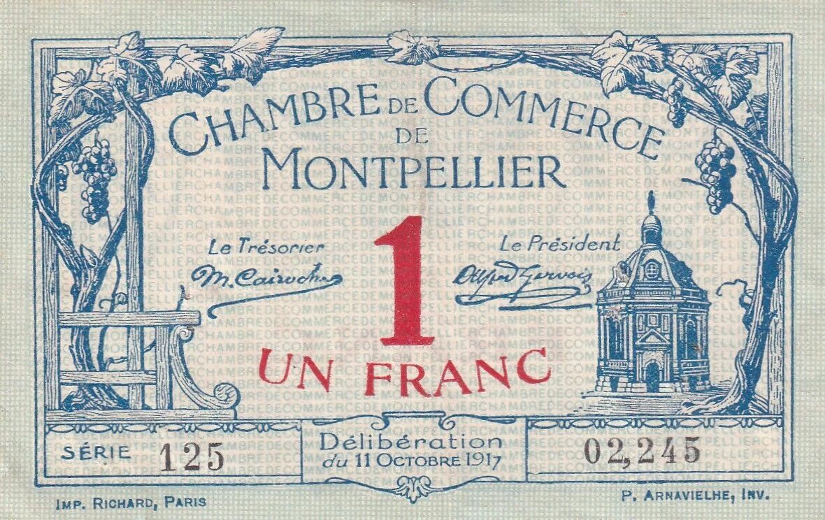 This 1 Franc banknote, issued by the Montpellier Chamber of Commerce in 1917, represents an example of emergency currency issued during a period of conflict. The banknote is part of Series 125.