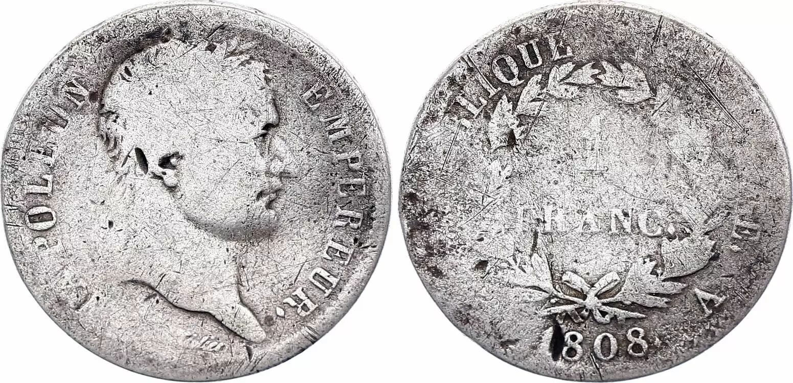 Home > > France 1 Franc Napoleon I - 1808 A Paris - Silver