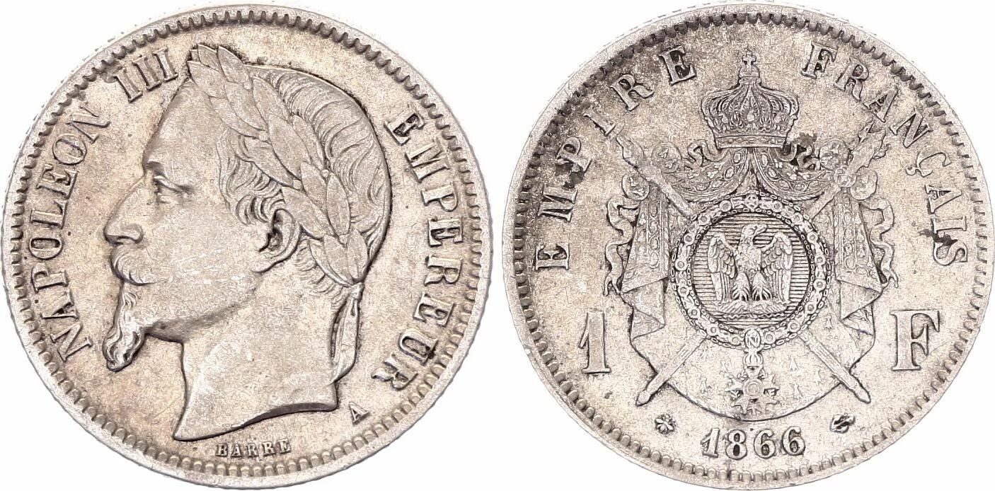 Cette pièce de monnaie est un franc français datant de 1866, frappée à Paris. Elle est émise sous le règne de Napoléon III. La pièce est fabriquée en argent, avec un titrage de 835 millièmes.