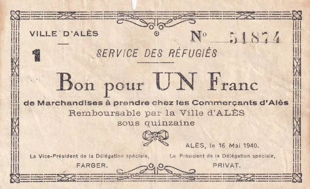 Banknote France 1 Franc - Refugee Services- Alès - 1940 - N°51874