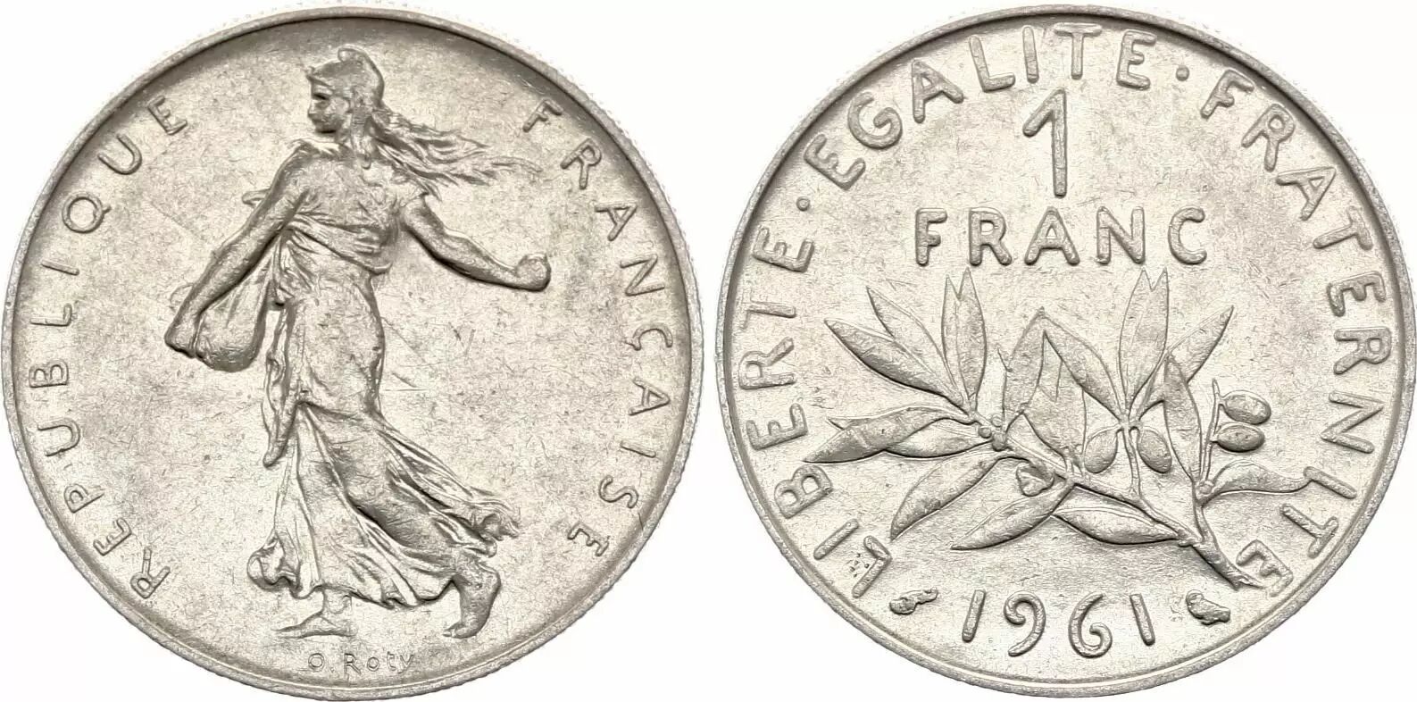 Reverse: The inscription "1 FRANC" is found, surrounded by two branches, one of oak and the other of olive, symbolizing strength and peace. The year of minting is inscribed at the bottom.