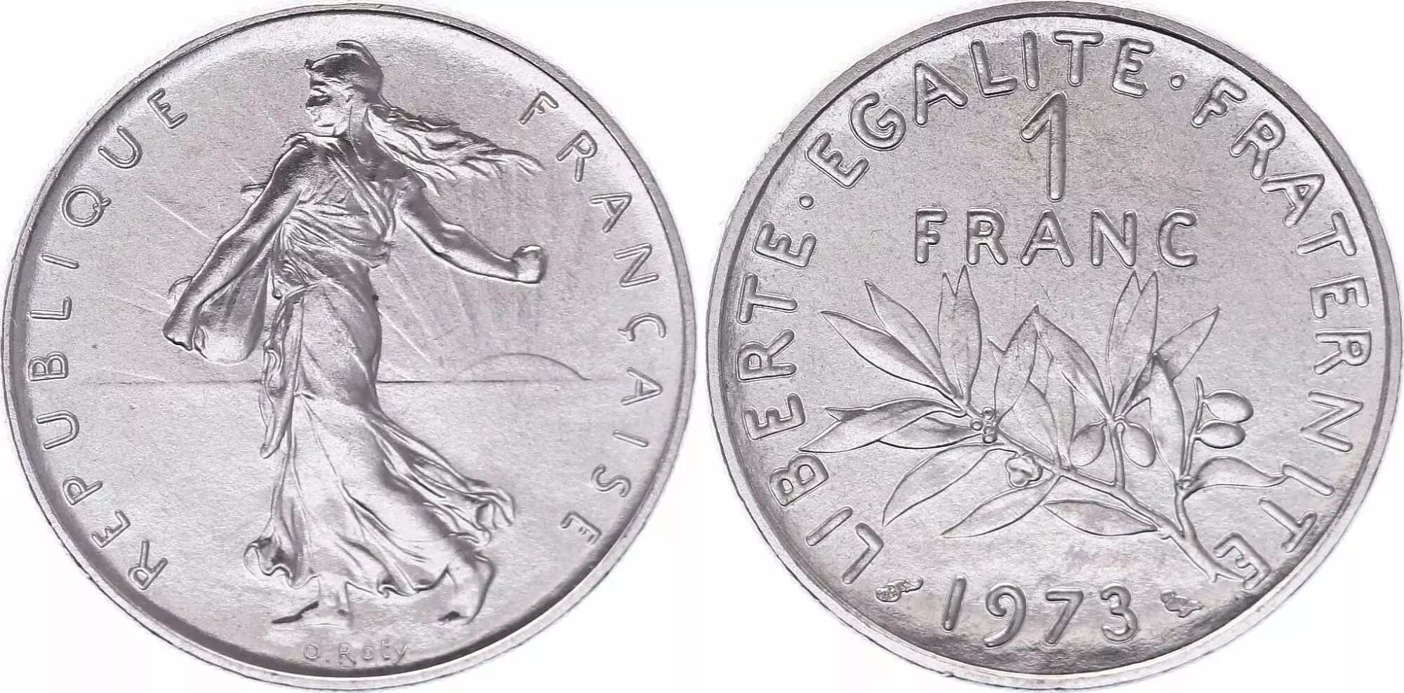 The reverse of the coin features an olive branch, a symbol of peace and fraternity, placed under the face value of "1 FRANC". The republican motto "LIBERTE ? EGALITE ? FRATERNITE" surrounds the composition. The year of issue, "1973", is indicated at the bottom of the coin. The engraver, Louis-Oscar Roty, is also credited for the design of this face.
