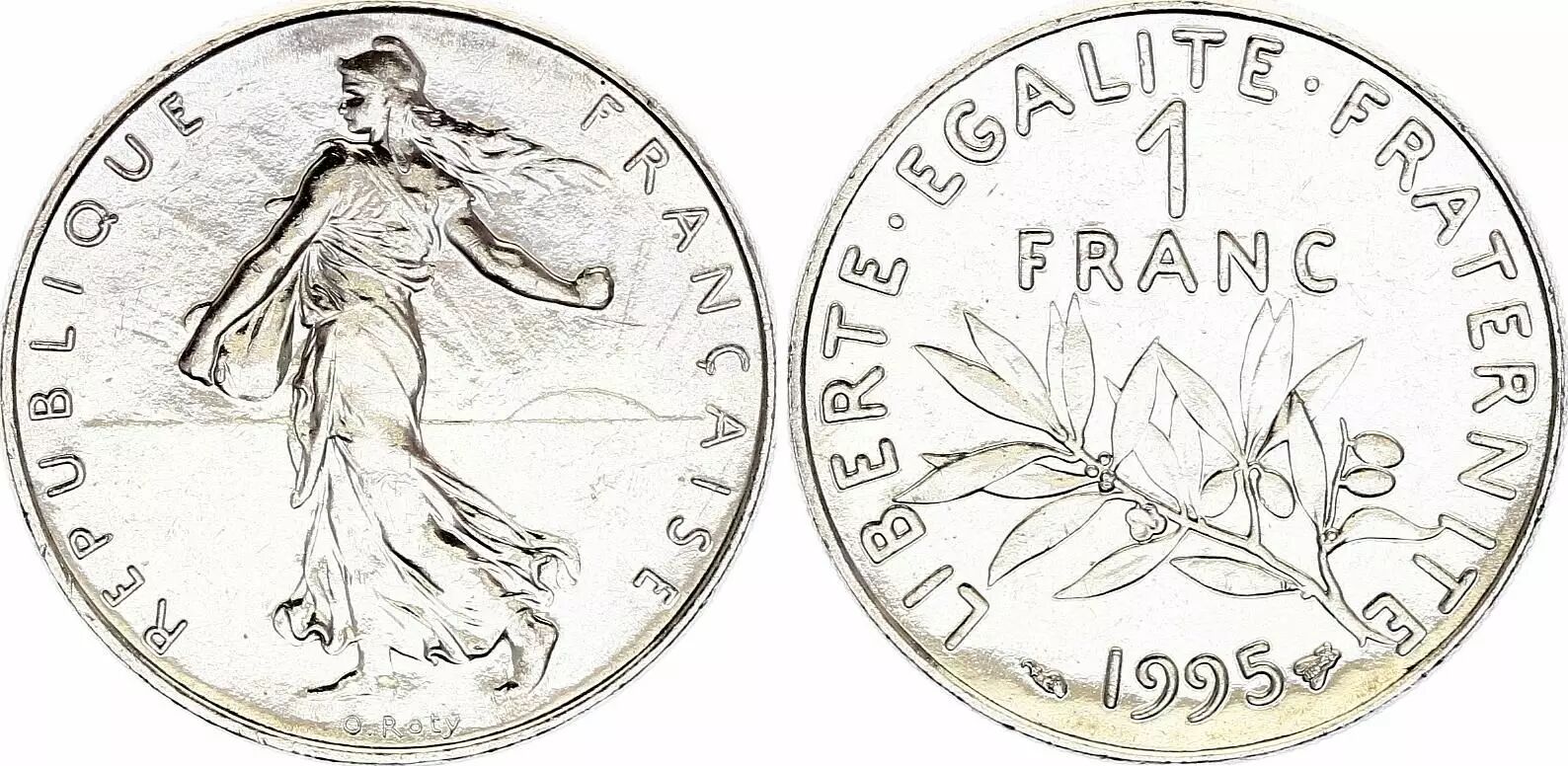 Reverse: The inscription "1 FRANC" is found, surrounded by two branches, one of oak and the other of olive, symbolizing strength and peace. The year of minting is inscribed at the bottom.