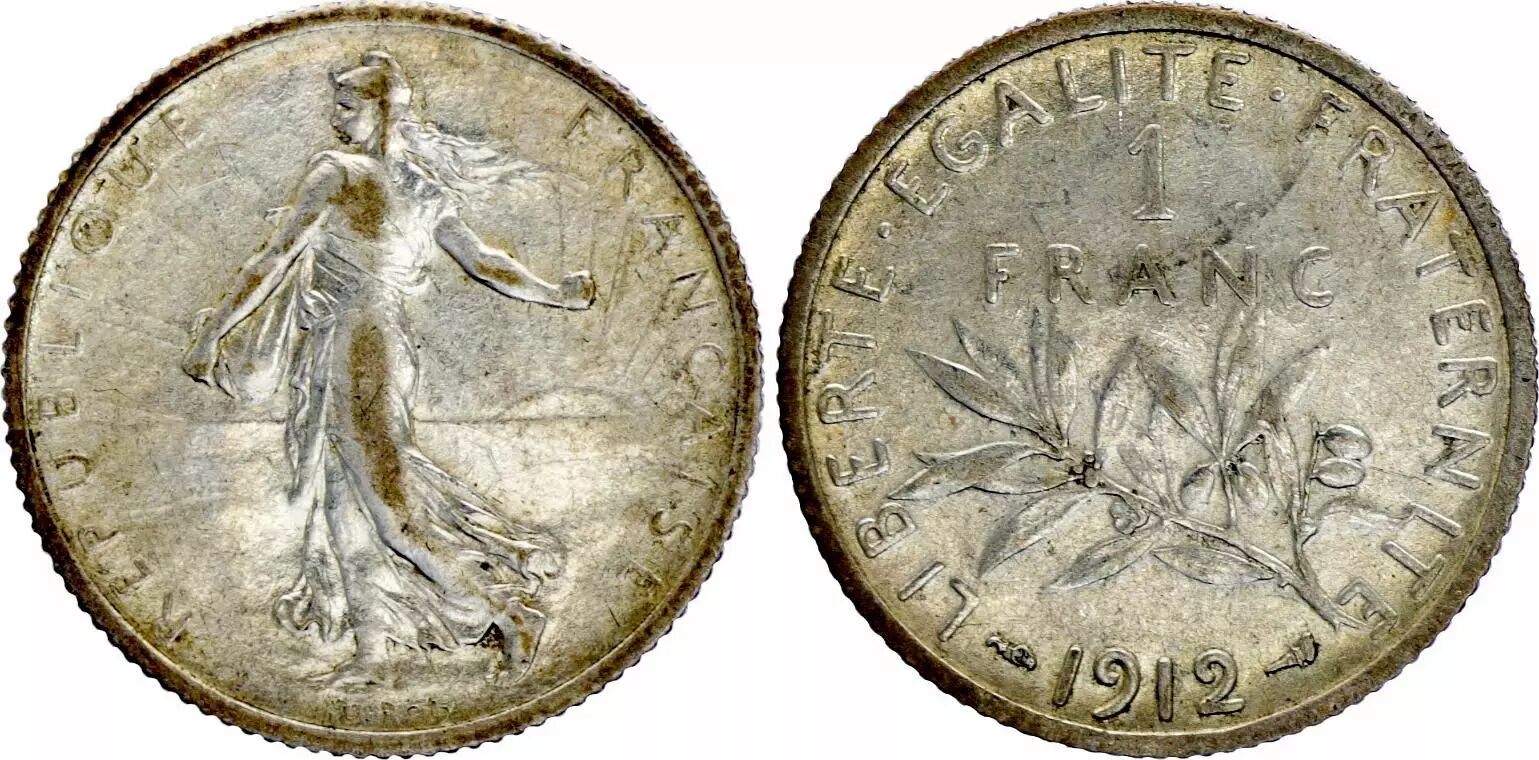 Coin France 1 Franc Semeuse - 1912 - Silver - VF - KM.844