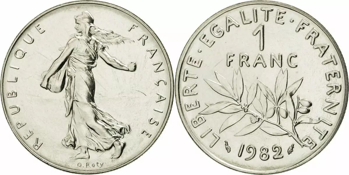 La pièce de 1 Franc Semeuse, datée de 1982, est une production française en nickel. Elle pèse 6 grammes et présente un diamètre de 24 millimètres. Cette pièce a été spécialement prélevée d'un coffret Fleur de Coin (FDC), garantissant un état de conservation optimal.