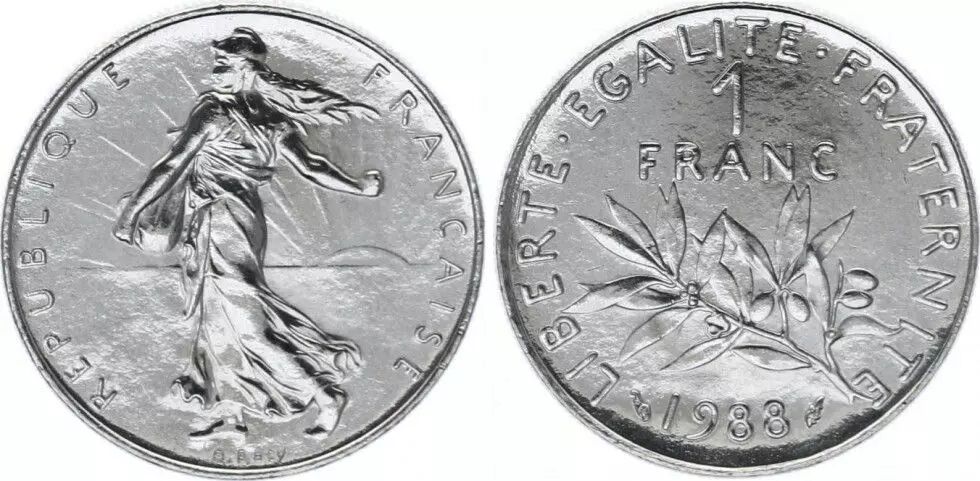 La pièce de 1 franc Semeuse, datée de 1988, est une pièce de monnaie française issue d'un coffret Fleur de Coin (FDC). Sa valeur nominale est de 1 franc, et elle est composée de nickel. Elle pèse 6 grammes et possède un diamètre de 24 millimètres.