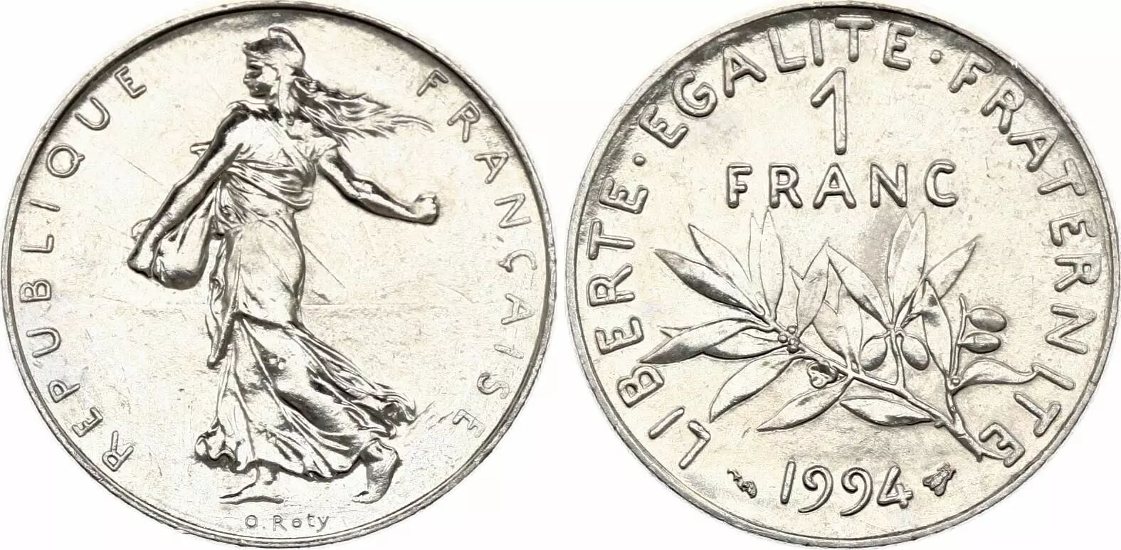 Le revers de la pièce affiche la valeur nominale, "1 / FRANC", disposée sur deux lignes. Cette inscription est placée au-dessus d'une branche d'olivier orientée vers la gauche. En dessous, l'année d'émission, 1993, est encadrée par les différents de l'atelier de frappe. La devise républicaine, "LIBERTE, EGALITE, FRATERNITE", est inscrite en arc de cercle autour des éléments centraux.