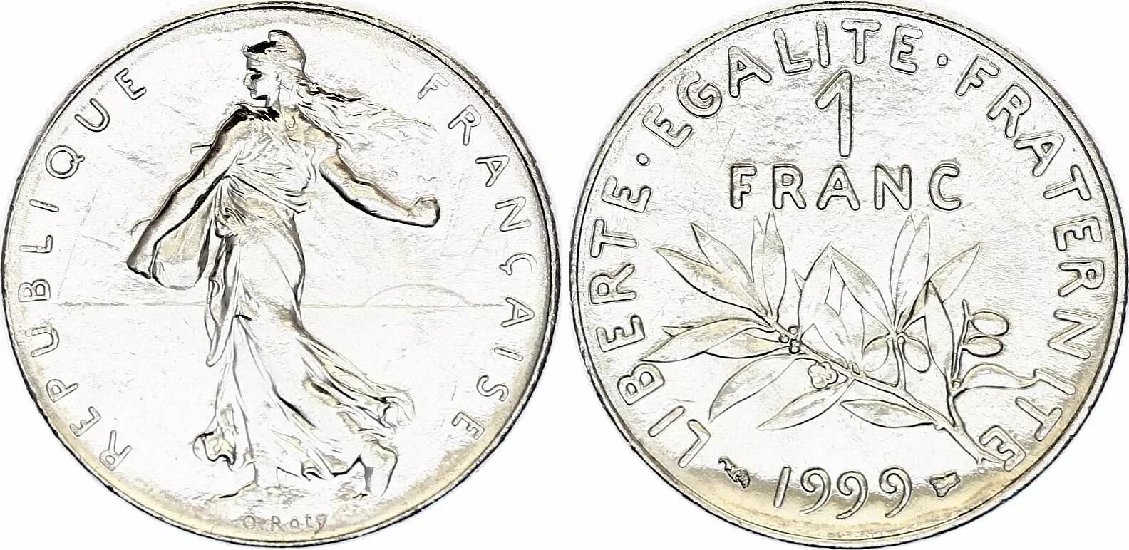 Revers : On trouve l'inscription "1 FRANC", entourée de deux branches, l'une de chêne et l'autre d'olivier, symbolisant la force et la paix. L'année de frappe est inscrite en bas.