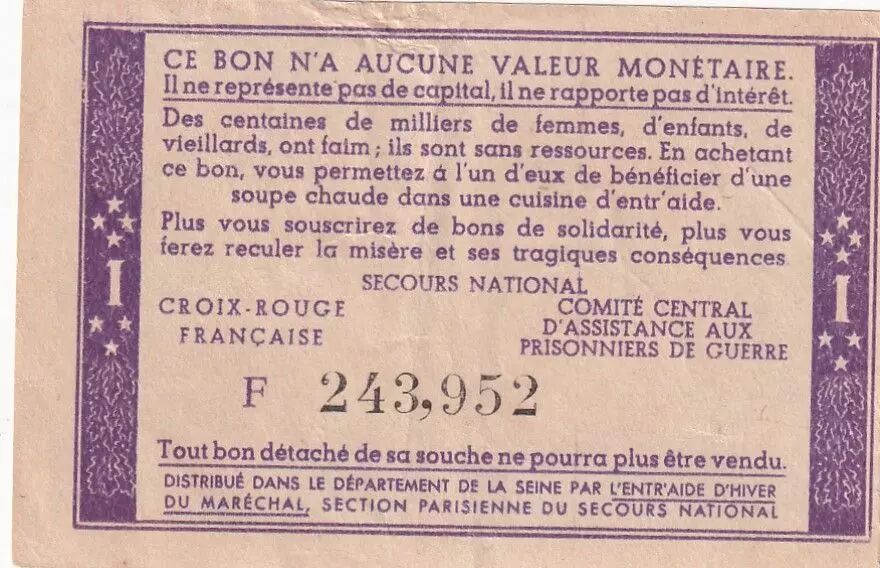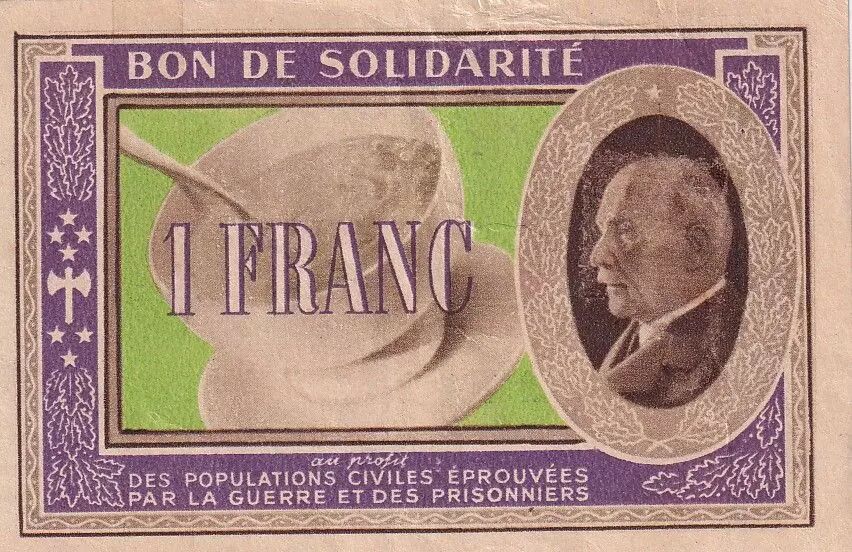 Banknote France 1 Franc Solidarity Bond - 1941-1942 - Serial F