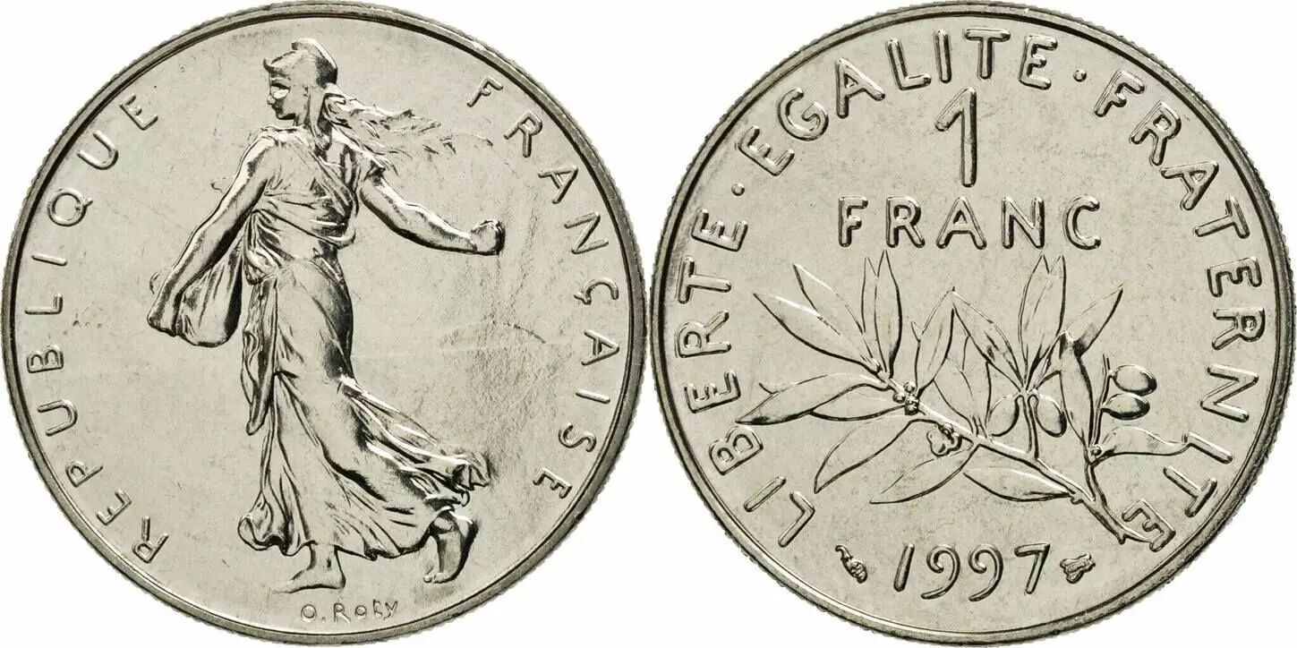 The 1 Franc Sower coin, struck in Brilliant Uncirculated (BU) quality in 1997, is a French coin. It has a face value of 1 franc and is made of nickel. The coin weighs 6 grams and has a diameter of 24 millimeters.