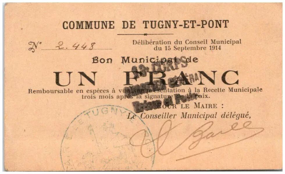 Billet France 1 Franc Tugny-Et-Pont Commune - 1914