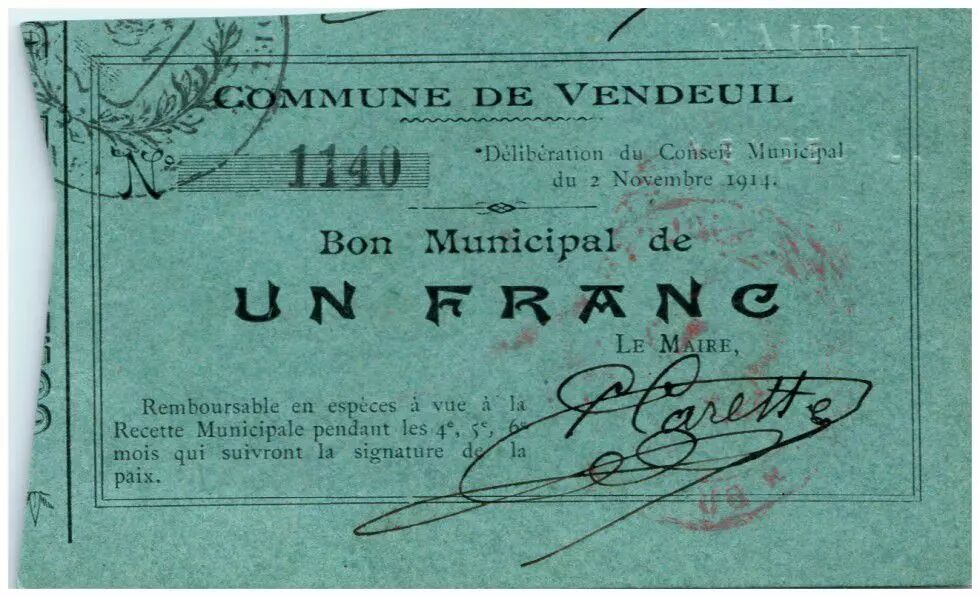 Banknote France 1 Franc Vendeuil City - 1914