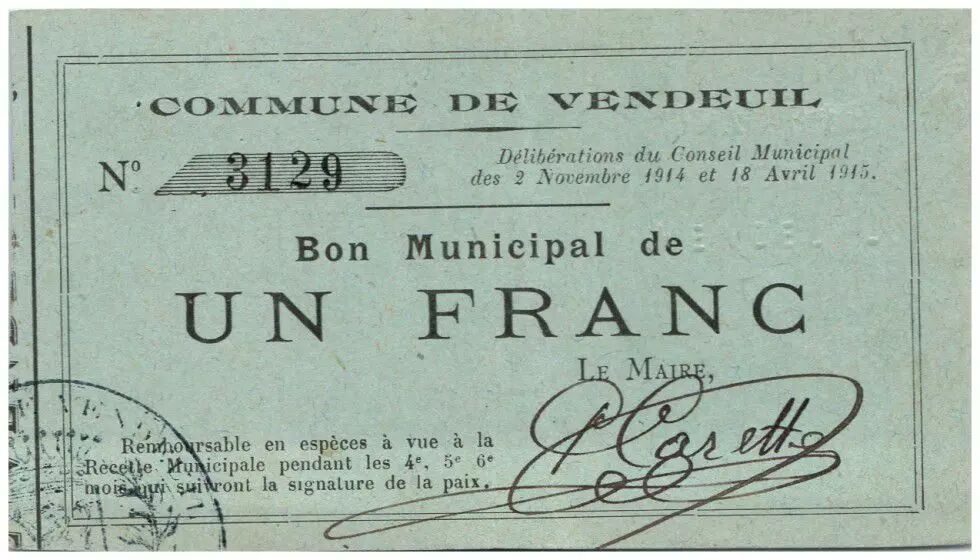 Banknote France 1 Franc Vendeuil City - 1915