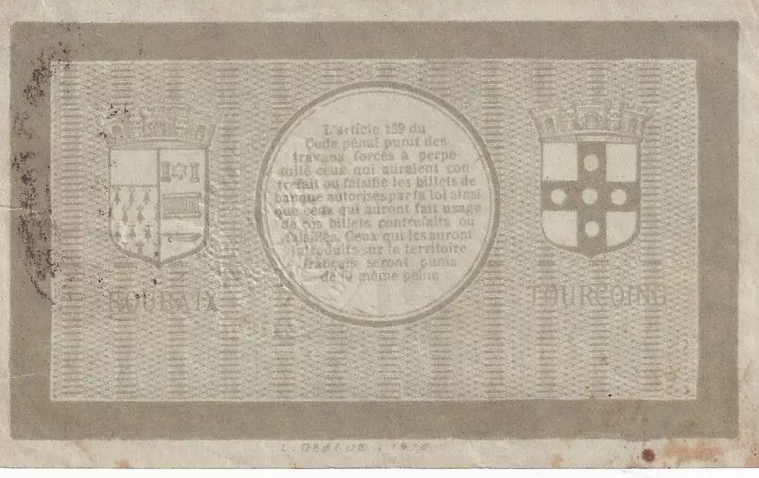 Le verso du billet présente les armoiries de la ville de Roubaix à gauche et celles de la ville de Tourcoing à droite. Au centre, l'article 139 du Code pénal est intégralement reproduit. Ce texte de loi détaille les peines encourues pour la contrefaçon ou la falsification de billets de banque autorisés par la loi, ainsi que pour l'usage ou l'introduction de tels billets contrefaits sur le territoire français. Les peines mentionnées incluent les travaux forcés à perpétuité.