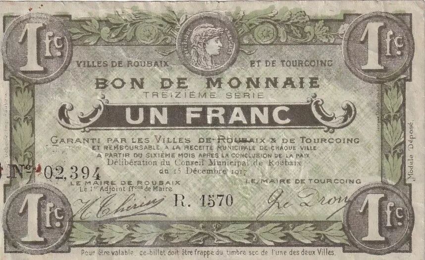 Ce billet de un franc a été émis par les villes de Roubaix et de Tourcoing en date du 15 décembre 1917. Il appartient à la 13ème série de cette émission locale.