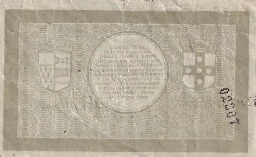 Le verso présente les armoiries de la ville de Roubaix à gauche et celles de la ville de Tourcoing à droite. Au centre, l'article 139 du Code pénal est reproduit. Ce texte de loi mentionne les peines encourues pour la contrefaçon ou la falsification de billets de banque autorisés par la loi, ainsi que pour l'usage ou l'introduction de tels billets contrefaits sur le territoire français. Les noms des villes de Roubaix et Tourcoing sont inscrits sous le texte de loi.