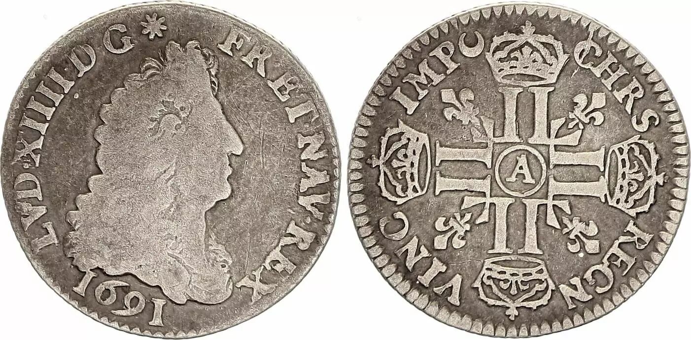 Pièce France 1/12 Ecu Louis XIV aux 8 L - 1691 A Paris - Argent