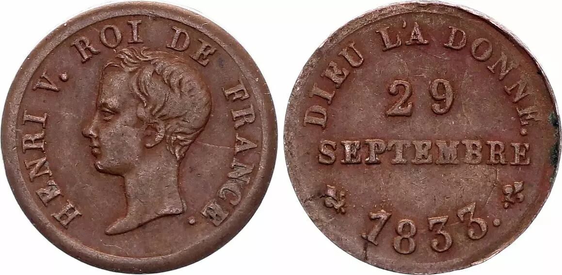 In 1833, after the abdication of Charles X in 1830 and the exile of the royal family, coins bearing the effigy of Henri V were minted by legitimists, especially abroad, to assert their support for his cause. These coins were often minted as symbols of royal legitimacy and protest against the July Monarchy, established after the 1830 Revolution that brought Louis-Philippe I, Duke of Orléans, to power.