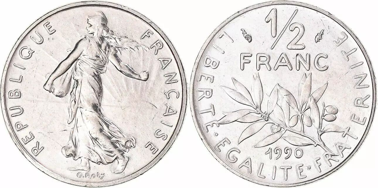 Le revers de la pièce met en scène un rameau d'olivier positionné sous la valeur faciale "1/2 FRANC". La devise nationale "LIBERTE, EGALITE, FRATERNITE" encercle cet ensemble. L'année d'émission, 1990, figure également sur cette face. Louis-Oscar Roty est également le graveur de ce côté de la pièce.