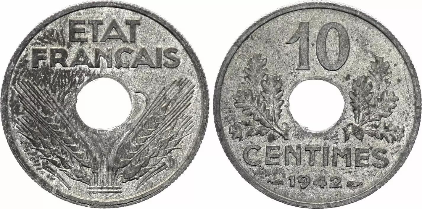Pièce France 10 Centimes 1942 - Type Etat Français Grand Module
