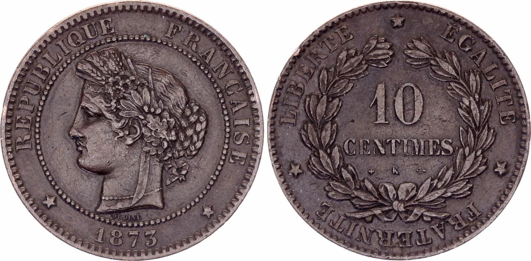 La pièce de 10 centimes Cérès, frappée en bronze, est une émission de la Troisième République française datant de 1873. Cette pièce a été produite par l'atelier monétaire de Bordeaux, identifié par la lettre "K".