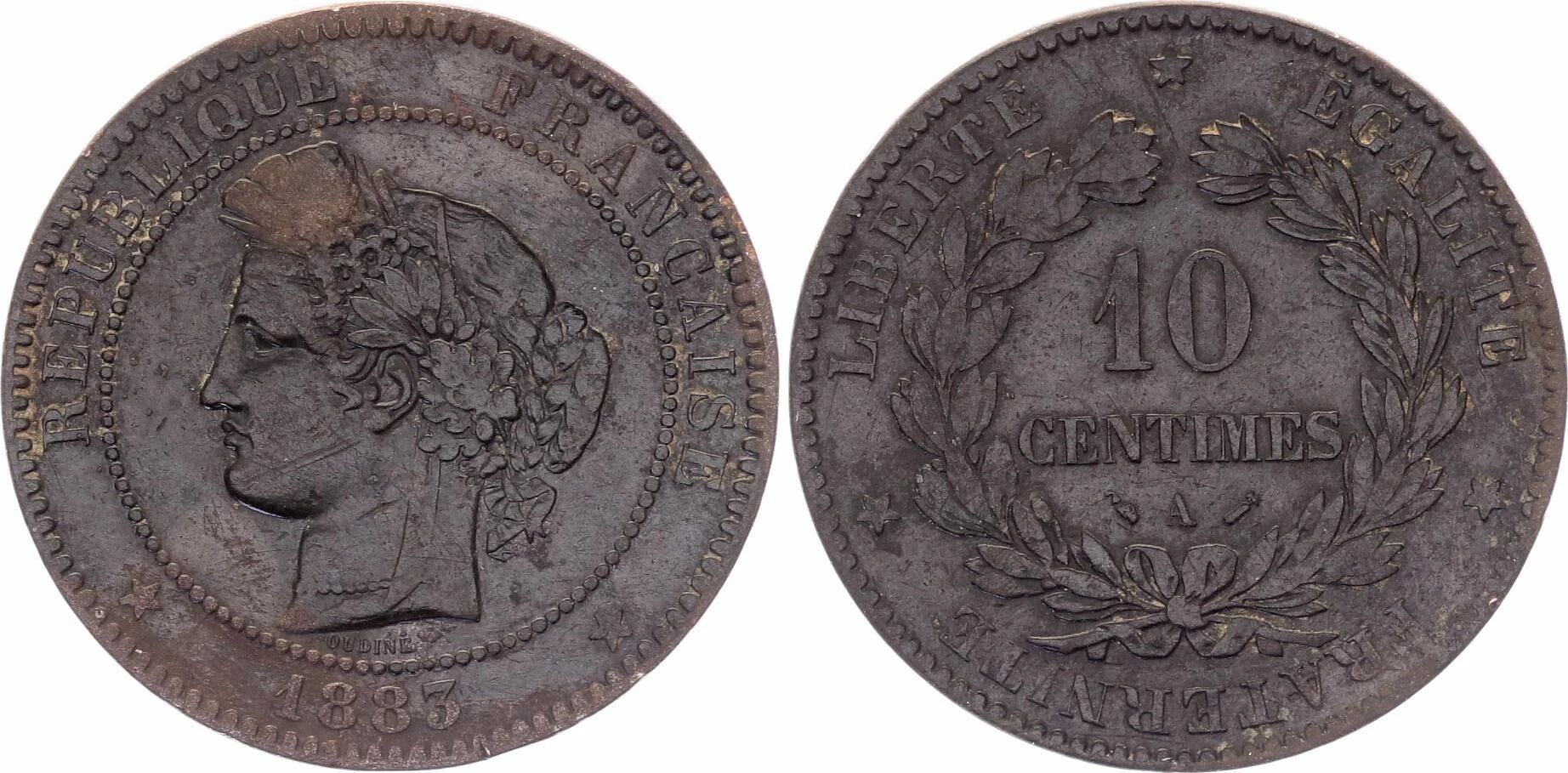 Cette pièce de monnaie française est un 10 Centimes Cérès, datant de 1883 et frappée à Paris, identifiée par le différent "A". Elle appartient à la période de la Troisième République.