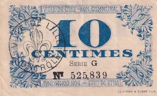 This 10 cent banknote is a communal bond issued by the city of Lille, France, dated April 17, 1918. It belongs to Series G.