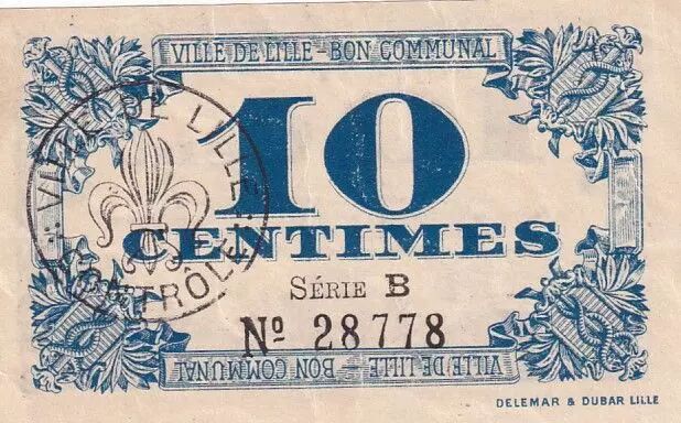 This 10 cent municipal note was issued by the city of Lille, France, on October 31, 1917. It is a municipal voucher, a form of local currency issued in times of crisis or cash shortage.