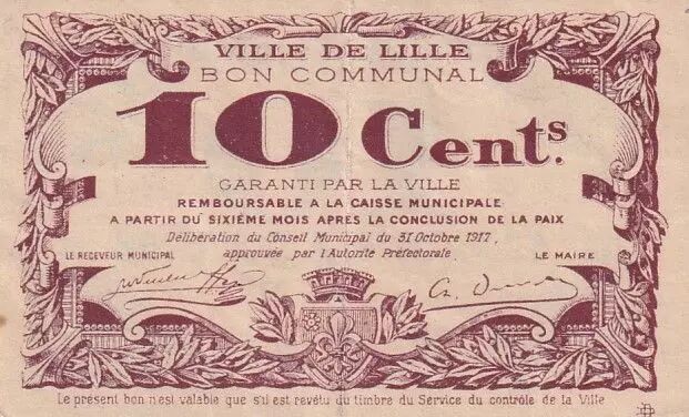 This 10 cent note is a communal bond issued by the city of Lille, France, dated October 31, 1917, belonging to Series D. It is a form of emergency currency issued in a context of economic difficulties linked to the First World War.
