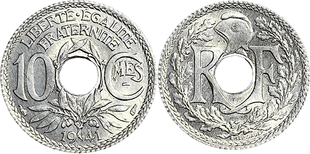 La valeur nominale de cette pièce est de 10 centimes, une subdivision de la monnaie française de l'époque. L'année d'émission est 1941, une période marquée par des événements historiques significatifs en France et en Europe.